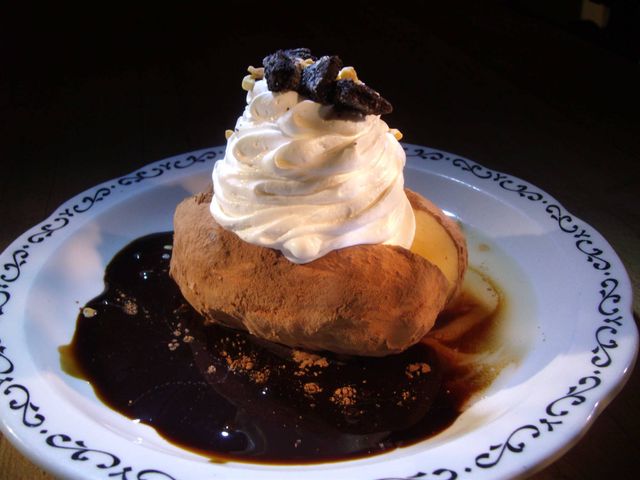 Виглядає страва дуже привабливо. У велику картоплину поміщають кульку ванільного морозива з високим вмістом вершкового жиру. Посипають какао-порошком і печивом. Покривають збитими вершками та меленим арахісом. Вся ця конструкція встановлюється на "калюжці" з шоколадного сиропу.