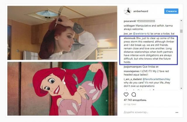 У своєму Instagram екс-кохана Маска та колишня дружина Джоні Деппа опублікувала фотоколаж, де порівняла свій знімок із фоткою діснеївської Русалочки. Під постом Маск залишив два коментарі, у яких і пояснив, що стало причиною їхнього розриву.