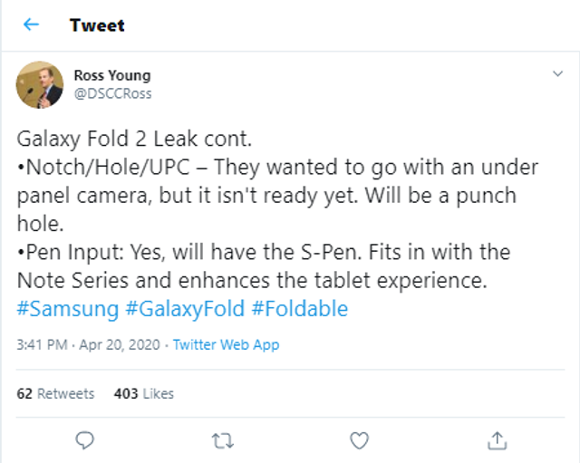 Інсайдер також підтвердив більш ранні витоки про те, що Galaxy Fold 2 отримає підтримку стилуса S Pen. З чуток, анонс апарату має відбутися у серпні 2020 року одночасно з презентацією нового покоління смартфонів Galaxy Note20. Передбачувана вартість та інші специфікації моделі не повідомляються.
