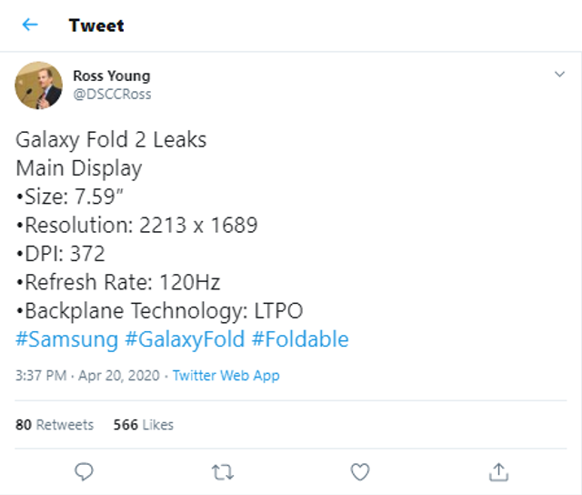 У своєму Twitter-блозі він опублікував докладні дані про основний і зовнішній екрани майбутньої новинки Samsung Galaxy Fold 2.