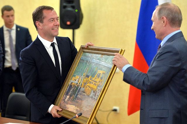Хоча вони такі ж працьовиті як Круть і Верть та дотепні як Бівіс і Батхет, але росіянам подобаються витівки своїх царьків. Вчора Владімір Путін публічно вручив на день народження Дмітрію Мєдвєдєву картину під назвою "Цех".