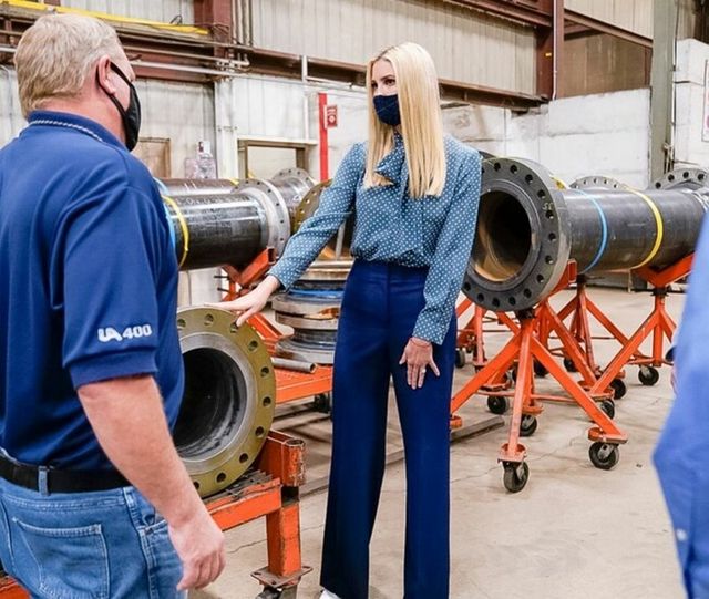 Завжди стильна Іванка для офіційного візиту в Team Industries вибрала синю блузу в горошок з бантом від Max Mara за 765 доларів, темно-сині розкльошені брюки і білі туфлі на шпильці.