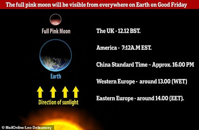 Повний місяць припадає на кожні 29,5 днів, коли Земля проходить між Місяцем і Сонцем. У Східній Європі Рожевий повний місяць настане 19 квітня о 14.00.