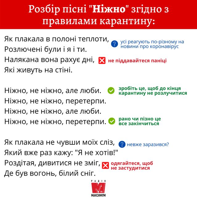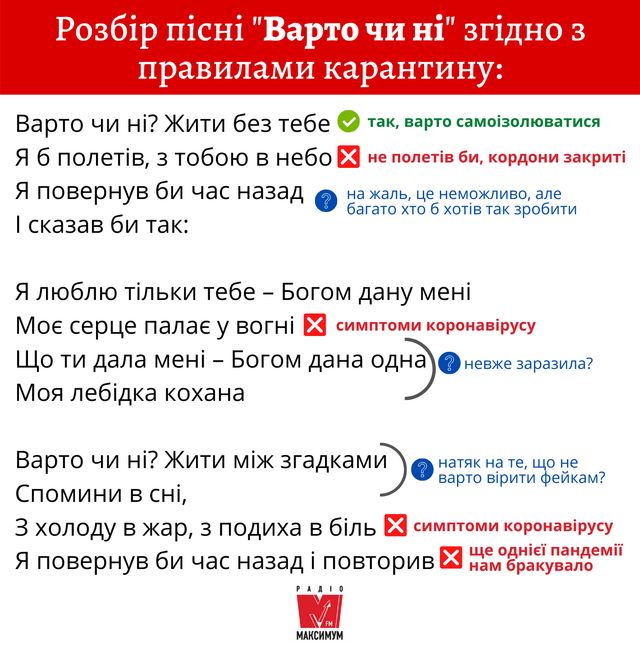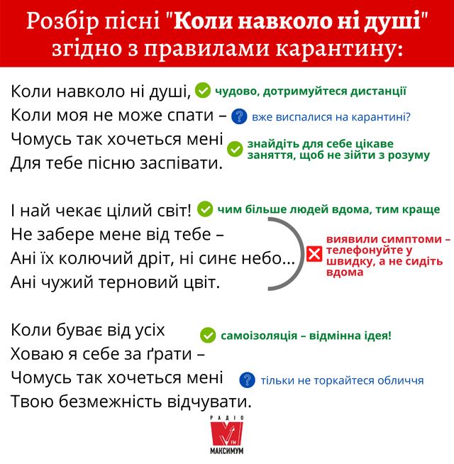 Під час карантину кожен урізноманітнює свої будні, як може. Головними ж помічниками у боротьбі з нудьгою є кіно та музика. Тож під час прослуховування українських пісень ми вирішили перевірити, наскільки вони відповідають правилам карантину.