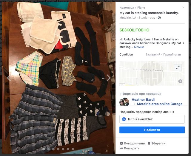 "Я вдячна, що він не приносить мені мертвого горобця або мишу, але я впевнена, що хтось у себе вдома чухає потилицю, адже їхній одяг продовжує зникати. Повірте мені, це не монстр з сушарки, а Адмірал. Якщо ви хочете забрати свої речі, я їх зібрала, і я знову їх виперу (котяча слина), ми будемо більш ніж раді, якщо ви заглянете до нас, прихопіть сумку і присоромте мого кота-мерзотника, якщо він буде поруч", – написала жінка.