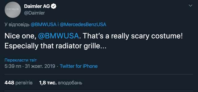 Автомобільний виробник BMW відзначив Хеловін кумедним твітом, у якому вирішив потролити свого головного конкурента – Mercedes-Benz. У Штутгарті жарт оцінили, але знайшли гідну відповідь, згадавши про патологічний гігантизм баварців щодо решітки радіатора.