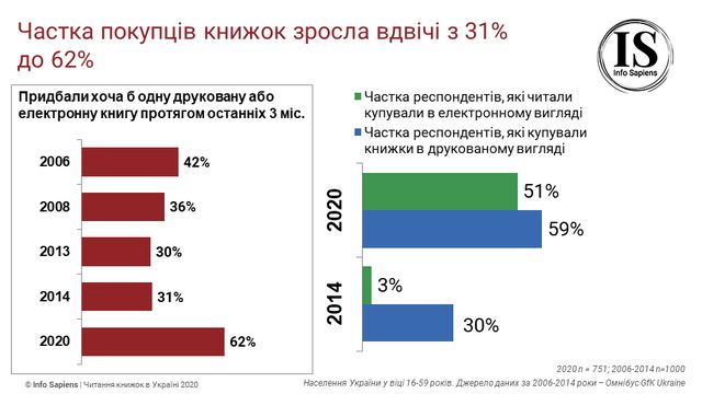 Суттєво зросла частка покупців книг. Так, за останні 3 місяці 62% опитаних купували книжки (у 2014 році таких було лише 31% респондентів). І якщо у 2014 році друкованих книг купували 30%, то у 2020 – 59. Також зросла частка покупців електронних книжок – з 3% до 51 відсотка.
