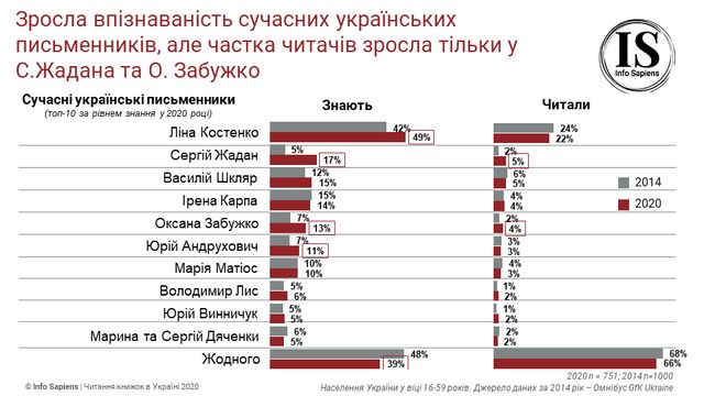 За останні роки зросла й упізнаваність українських авторів. Якщо у 2014 році 52% респондентів називали бодай одного сучасного українського письменника, то у 2020 цей показник зріс до 61% опитаних.