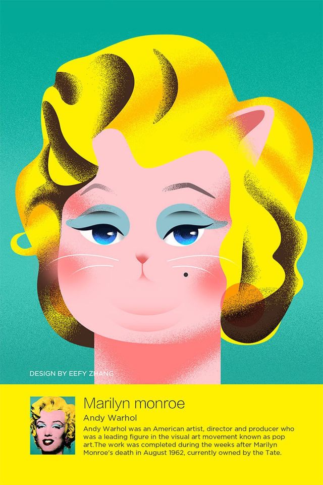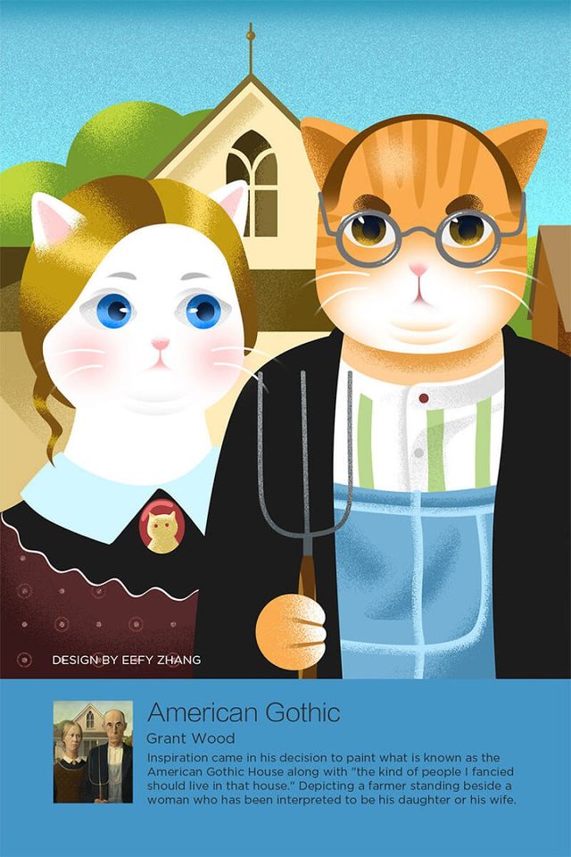 Знайомтесь, це Еффі Чжан (Effy Zhang) – китайський ілюстратор та дизайнер, який вирішив відтворити популярні полотна, але замінити у них людей на котів. Відтак домашні ілюбленці стали героями картин "Дівчина з перловою сережкою", "Американської готики" і "Мерилін Монро". Зацініть!