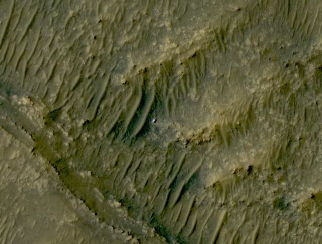 Як пише Live Science, Perseverance зараз розташований у районі кратера Єзеро, біля рівнини Ісіди. Його сфотографували з висоти сотень кілометрів, і виглядає марсохід як невелика срібляста цятка у центрі знімка.