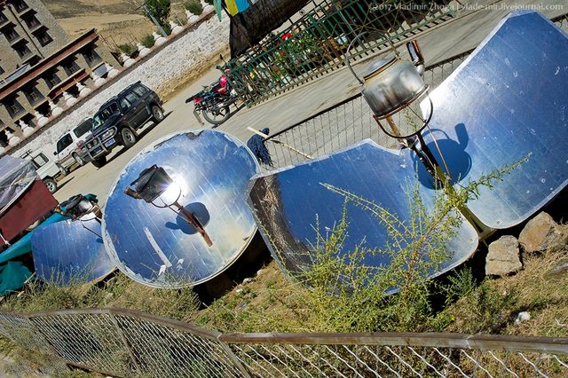 Навіть сьогодні, коли електрика стає доступною, тибетці все одно продовжують гріти воду на таких сонячних тарілках. Чи то це звичка, чи данина традиції, а може просто економлять гроші. За електрику і газ же треба платити, а Сонце світить абсолютно безкоштовно!