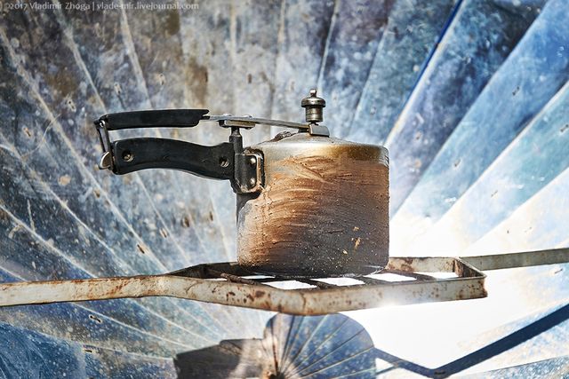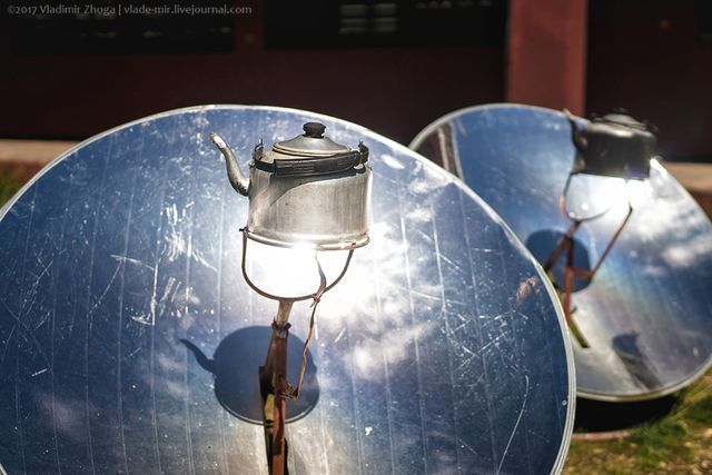 Виявляється, все що потрібно для приготування їжі на сонці – це великі дзеркальні тарілки. Небо тут чисте, сонце світить, жар йде, чайники киплять! Та й до того ж тут на висоті вода кипить при меншій температурі, ніж "на землі". Фізика!