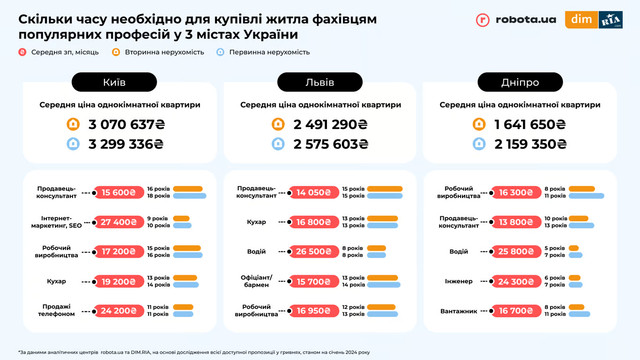 У Львові такий фахівець має витратити 15 років життя для купівлі власної оселі. Водій у Львові із середньою зарплатою у 26,5 тис. грн має витратити вісім років, а в Дніпрі – п'ять років, щоб купити житло на вторинному ринку і 7 років – на первинному ринку.