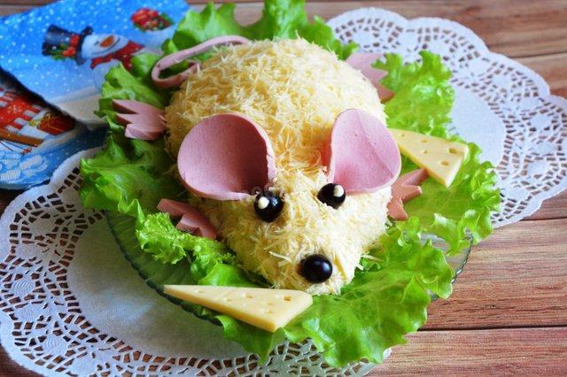 - Верхівку салату прикрасити тертими жовтками. Щоб цибуля не зіпсувала смак, попередньо залийте її окропом, залиште на 5 хвилин і промийте холодною водою.