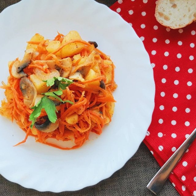 - Моркву очистьте та натріть на тертці для корейської моркви. Обсмажте на олії до м'якості, на невеликому вогні.