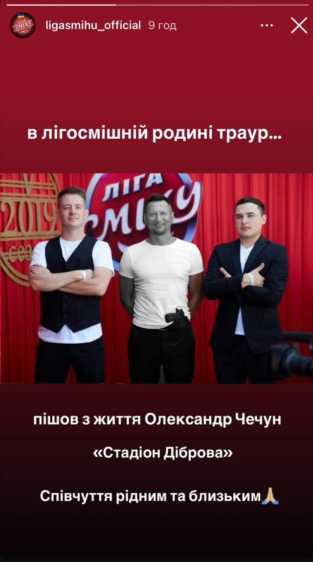 На 42-му році життя помер учасник команди "Стадіон Діброва" та актор гумористичного шоу "Ліга сміху" Олександр Чечун. Лікарі близько року боролися за його життя після того, як він зазнав поранення на фронті.
