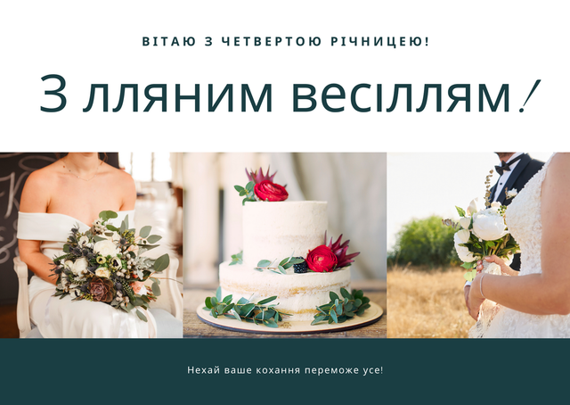 Дороге подружжя, сьогодні ваша сім'я святкує своє чотириріччя, іменоване в народі лляним весіллям. Нехай ваше сімейне життя буде таким же гладким, як лляна скатертина, а ваші взаємини стануть з роками такими міцними, що ніякі негаразди не зможуть їх порвати!