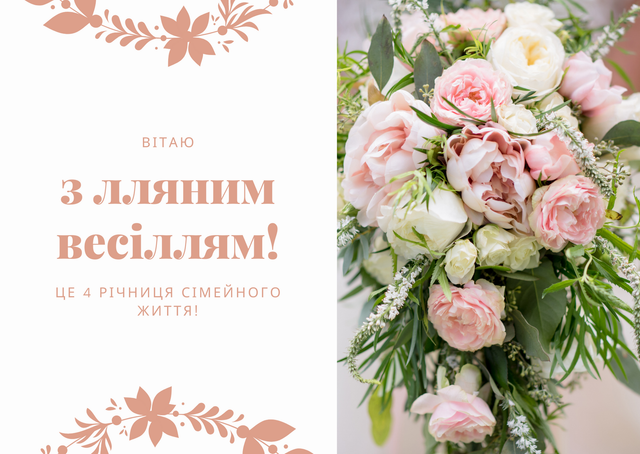 Від щирого серця хочу вас привітати з лляним весіллям. Як росте льон, нехай так само зростає ваше сімейне щастя. Наближається ваш перший ювілей, а поки міцніше тримайте один одного за руки, зігрівайте один одного любов'ю та увагою. Будьте міцною і самодостатньою сім'єю, щасливим та вірним подружжям. Нехай ваш спільний шлях буде таким же світлим і гладким, як лляне полотно.