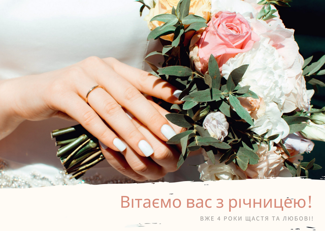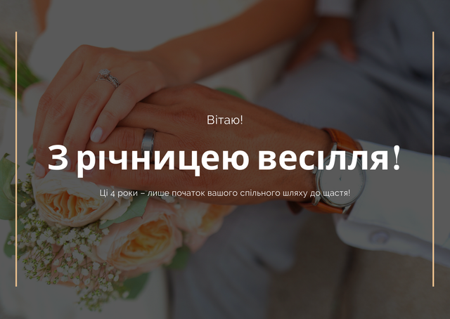 Подумати тільки, вже четверта річниця з того самого неймовірного, наповненого почуттями дня, як ви стали узаконеним одним цілим – сім'єю. А здається, тільки вчора ви крадькома прощалися біля під'їзду, не бажаючи розлучатися. В цей день, настільки особливий для вашої родини, мені хотілося б побажати вам запаморочливої любові, яку ви неодмінно збережіть до кінця своїх днів, гармонії, терпіння, взаємної підтримки та розуміння, адже саме ці компоненти є основою сімейної ідилії. Не припиняйте один одного дивувати. Даруйте нові яскраві емоції. Захоплюйтеся один одним і бережіть ваше дивовижне, ніжне почуття, завдяки якому ви створили сім'ю.