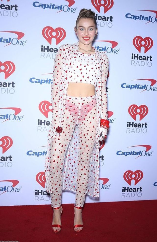 24-річна Майлі Сайрус взялася за старе: на музичному фестивалі радіо iHeart зірка з'явилася в напівпрозорих білих легінсах, з-під яких було видно червоні мереживні трусики.
