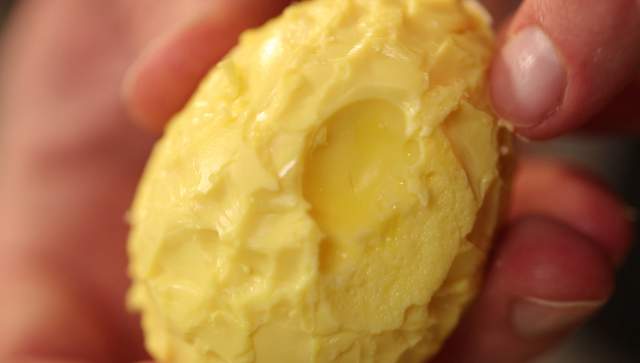 Лайфхак "золоте яєчко". Беремо сире яйце і гарненько струшуємо, для цього поміщаємо його в колготки на середину (можна у великій носок або панчохи) і двома руками розкручуємо протягом 5 хвилин. Далі варимо як звичайно. Має вийти дуже красиве жовте яйце.