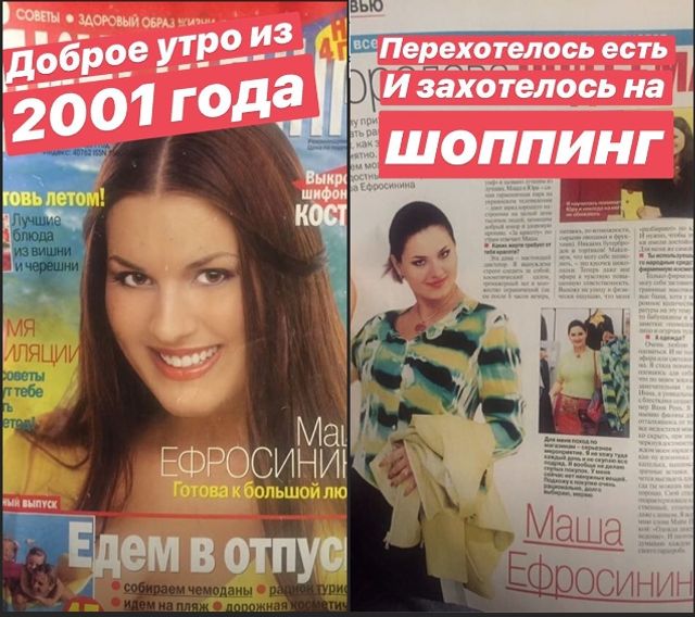 У своїх Instagram-сторіс вона опублікувала два архівних фото, на яких вона позує на обкладинці журналу і кумедно підписала їх. Судячи з підпису Маші, знімки були зроблені в 2001 році. У той час вона важила на 20 кілограмів більше.