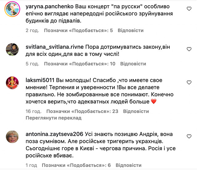 У коментарях думки підписників Білоконь розділилися. Одні підтримують артистів і не бачать у їхніх діях нічого страшного. Інші – нагадали, що російська мова – це мова танків, і закликали швидше перекладати пісні українською мовою.