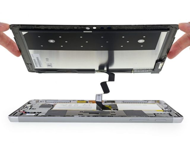 Розбирання пристрою починається з найскладнішого – демонтажу дисплея. Ризик пошкодити при цьому панель дуже високий. Власне, у випадку з Microsoft Surface Pro 3 так і вийшло, але з Microsoft Surface Go, як бачимо, вийшло зняти екран, не зламавши його, попри велику кількість клею та підпружинений металевий кронштейн, з яким довелося трохи повозитися. Що стосується дисплея, в цьому випадку це 10-дюймова панель IPS з роздільною здатністю 1800х1200 пікселів.