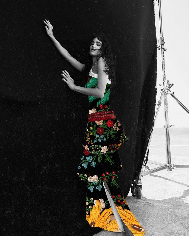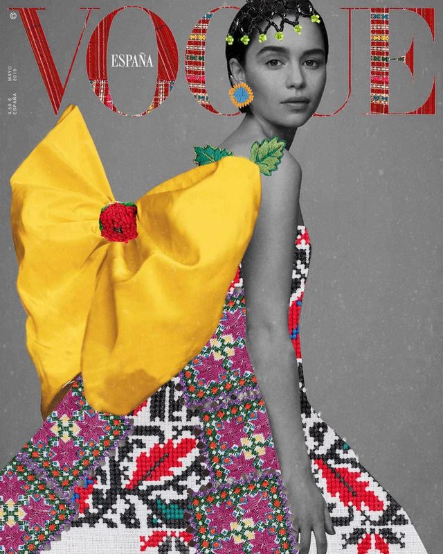 Так, Емілія Кларк на обкладинці VOGUE Espana постала у розкішному образі. На колажі вона барвистій вишиванці з величезним жовтим бантом.