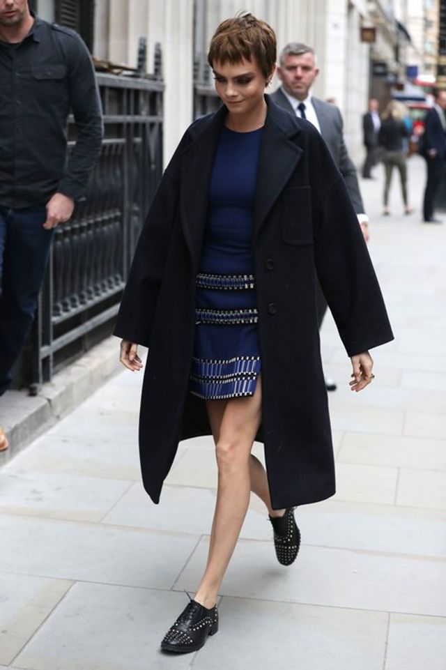 Папараці підловили знаменитість ще до презентації. Кара поспішала на інтерв'ю для Global Radio в Лондоні. Для зустрічі в студії модель обрала білу міні-сукню, об'ємне темно-синє пальто і черевики без підборів.