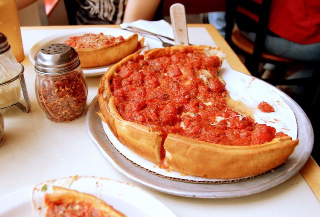 Чикаго славиться своїми товстими, величезними піцами. Вони схожі на тарілочки з тіста, в які складаються кілограми добірної начинки. Вважається, що пузата піца була придумана в одному з найстаріших в місті ресторанів під назвою Uno.