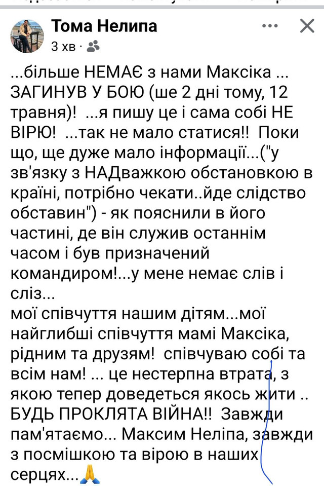 Дмитро Оскін пізно ввечері 14 травня виклав скриншот повідомлення дружини Неліпи про смерть чоловіка. Жінка повідомила, що Максим Неліпа загинув ще 12 травня в бою.