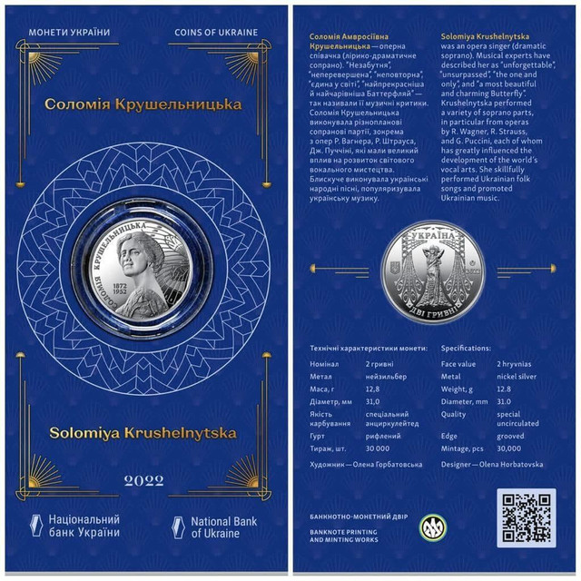 Від 19 жовтня в Україні з'явиться сувенірна монета з Соломією Крушельницькою. Номінал монети – 2 гривні. Тираж монети – 30 000 штук.