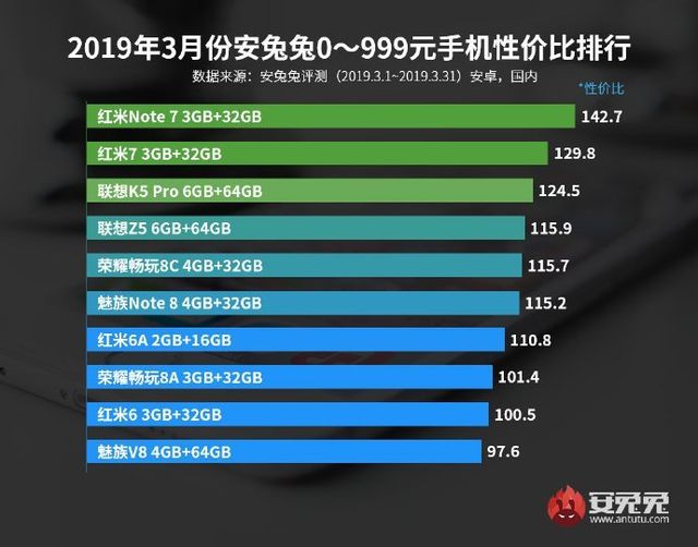 Перший рейтинг для смартфонів у ціновій категорії до 1000 юанів (до 153 доларів) очолив Redmi Note 7 Pro з 3 ГБ оперативної і 32 ГБ флеш-пам'яті. Його коефіцієнт VFM (value for money) склав 142,7. На другому місці опинився Redmi 7 у версії 3/32 ГБ, а третє дісталося Lenovo K5 Note Pro 6/64 ГБ.