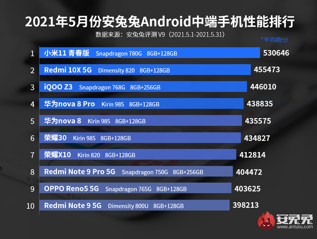 На четвертому, п'ятому і шостому місцях розмістилися HUAWEI nova 8 Pro, nova 8 і Honor 30, побудовані на базі Kirin 985. Далі за списком розташувалися Honor X10, Redmi Note 9 Pro 5G, OPPO Reno5 5G і Redmi Note 9 5G.