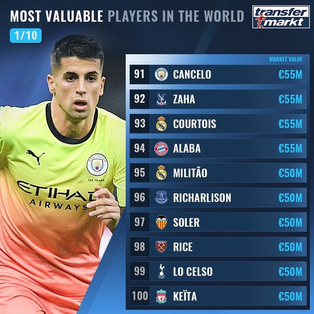Ліонель Мессі із ціною в майже 150 мільйонів євро став шостим у рейтингу, а Кріштіану Роналду розташувався на 26-й позиції із "цінником" у 90 мільйонів. Українські футболісти в список не ввійшли.