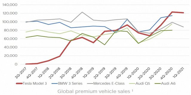Якщо порівнювати ці показники з іншими седанами преміум-класу (BMW 3-Series і Mercedes E-Class), то Model 3 виявилася безумовним лідером на ринку, обійшовши не тільки транспортні засоби на електричному приводі, але й бензинові автомобілі.
