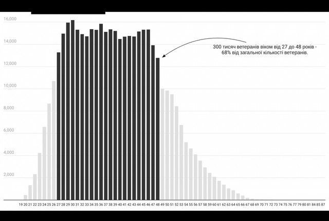 Вік. Серед ветеранів є представники усіх вікових груп. Найбільша кількість серед осіб у віці від 31 до 40 років (34,5%) та від 19 до 30 років (31%).