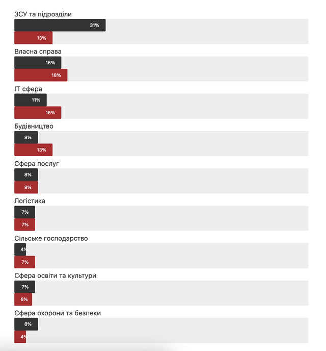Майже третина (31%) опитаних ветеранів наразі перебувають на службі – військовослужбовці ЗСУ та інші силові підрозділи. Наступна за чисельністю категорія – це 16% тих, хто займається власною справою. Ще 11% залучені в ІТ сфері.
