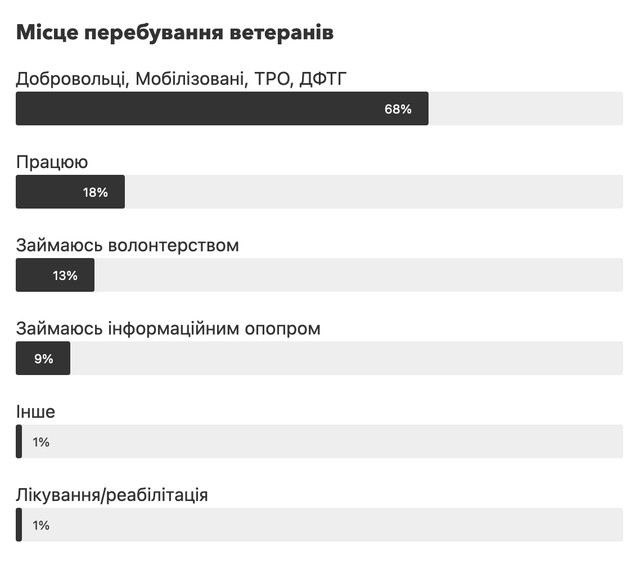 Більшість ветеранів після повномасштабного вторгнення росії на територію України повернулися на війну – 68%. Відомо, що 18% продовжили працювати, а 13% наразі займаються волонтерством.