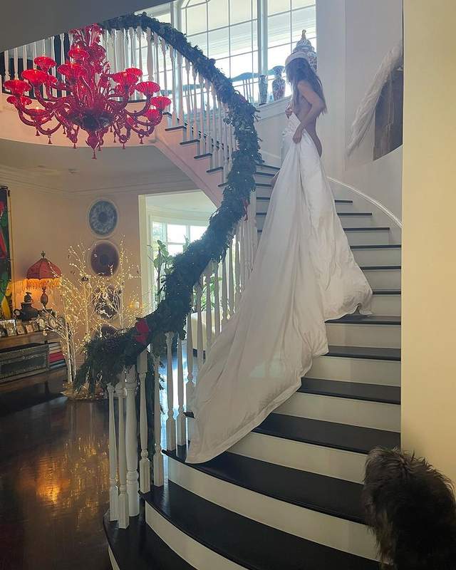 Так, на свіжих різдвяних знімках 48-річна Хайді Клум, які вона показала в Instagram, укуталася у величезну білу ковдру, при цьому на ній не було одягу, лише червона шапка. Модель позувала, піднімаючись сходами і прикриваючи тіло.