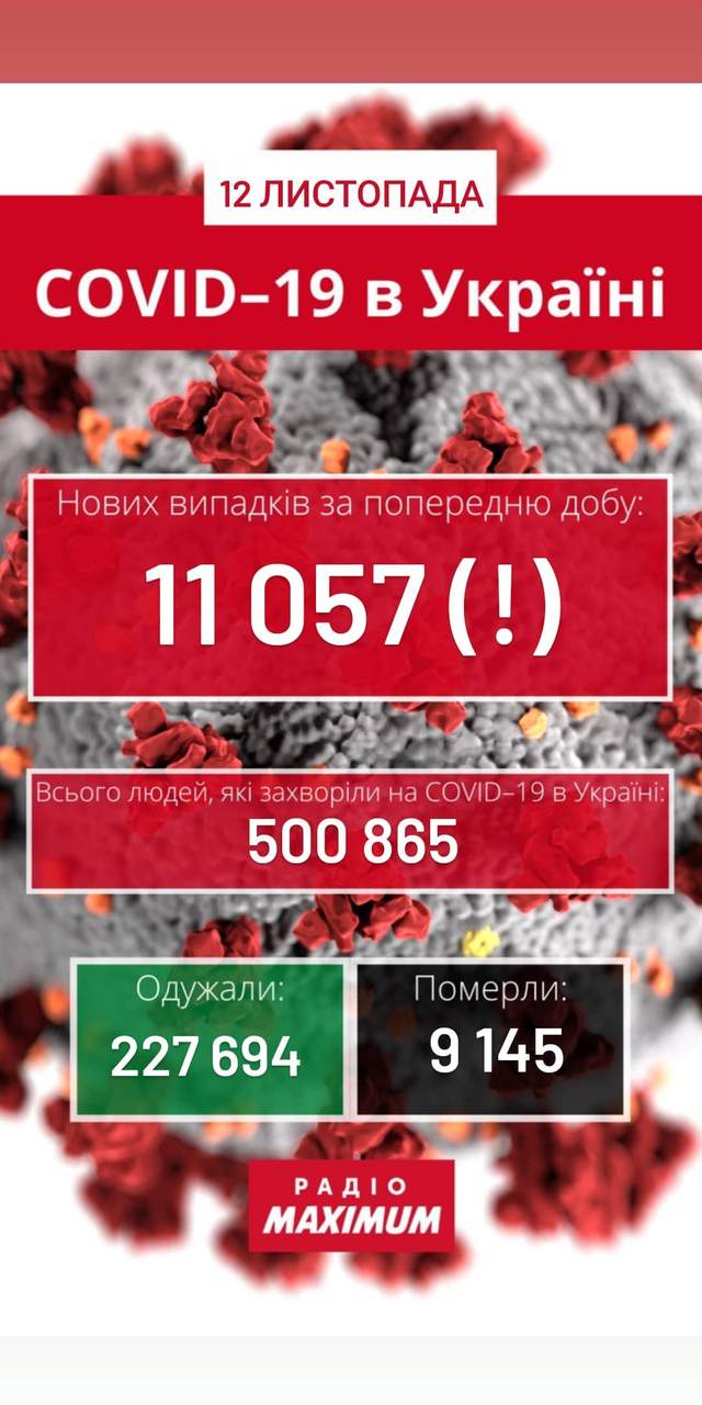 Офіційна статистика станом на 09:00 четверга, 12 листопада: в Україні виявлено 500 865 випадків коронавірусу.