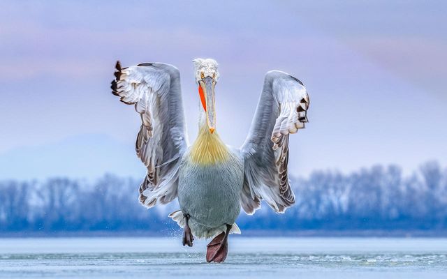 Автор роботи розповіла, що під час зйомок стала свідком незвичайного видовища. Улюблене місце пеліканів – озеро Керкіні – замерзло. Птахи не звикли до подібного і не знали, як поводитися на слизькому льоду. У підсумку вони "повеселили" фотографа курйозними витівками.