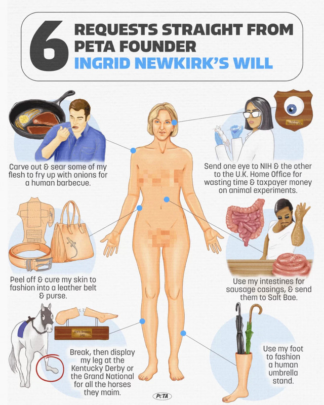 Засновниця і президентка зоозахисної організації PETA (People for the Ethical Treatment of Animals) Інгрід Ньюкірк оновила свій заповіт 2003 року. У ньому вона наказала використати свої частини тіла й органи після смерті.
