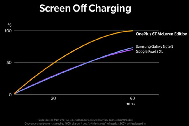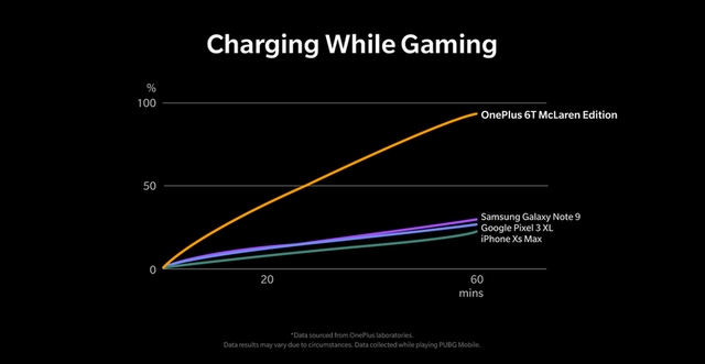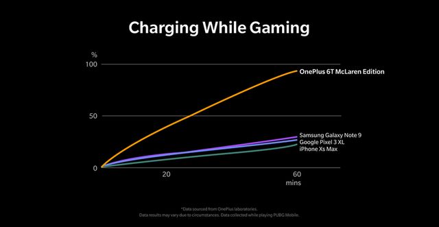 У результаті, OnePlus 6T McLaren можна повністю зарядити всього за одну годину, якщо не користуватися пристроєм. Компанія порівнює швидкість зарядки зі смартфонами Samsung Galaxy Note 9 і Google Pixel 3 XL, які зарядилися на 60-65% за той же проміжок часу. На іншому графіку виробник показує, що під час мобільного геймінгу, батарея зарядиться до 90-95% за 60 хвилин.