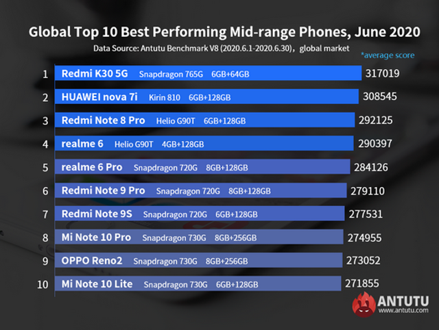 На відміну від флагманського сегмента, набір процесорів середнього класу в рейтингу продуктивності виявився різноманітнішим. Так, переможець побудований на базі чипа Snapdragon 765G, інші процесори Qualcomm у топ-10 представлені моделями Snapdragon 720G і 730G, а пристрої на базі Kirin 810 і MediaTek Helio G90T опинилися у верхній частині рейтингу.