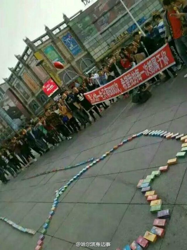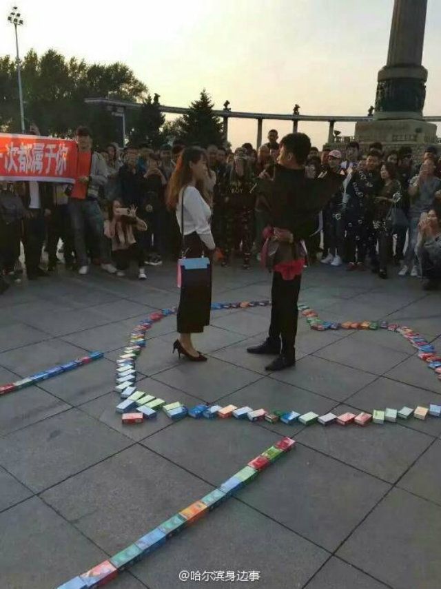 Про це повідомляє видання ЕКД! Курйоз стався на центральній площі Харбіна в провінції Хейлунцзян, де посеред дня молодик почав викладати серце з коробок з презервативами. Після того, як приготування були закінчені, хлопець заманив кохану на площу, став на коліно і запропонував бути його дівчиною.