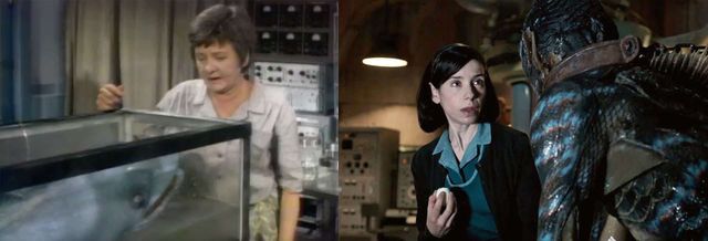 В обох історіях прибиральниці працюють у нічну зміну, закохуються в морську істоту, приносять їй їжу і танцюють перед нею зі шваброю під мелодію пісні про кохання. Обидві жінки намагаються навчитися спілкуватися з істотою і дізнаються про плани працівників лабораторії вбити цю живу істоту. Опісля вони розробляють плани порятунку істоти, викрадаючи її в кошику для білизни. Жінкам допомагає подруга-прибиральниця.