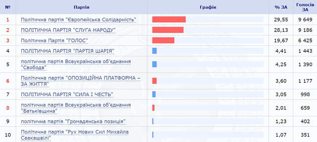 У першій десятці також опинились партія Шарія, ВО "Свобода", "Опозиційна платформа – За життя", "Батьківщина", "Громадянська позиція", а також "Рух Нових Сил Михайла Саакашвілі".