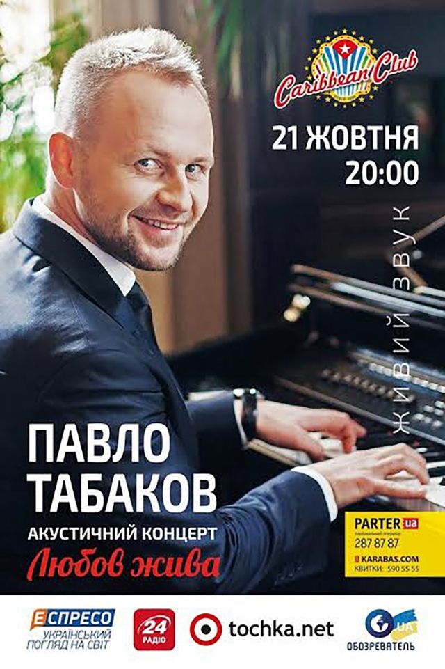 У п’ятницю, 21 жовтня, володар титулу "Голос країни" Павло Табаков представить у Києві, в Caribbean Club (вул. Симона Петлюри, 4), нову акустичну програму "Любов жива".